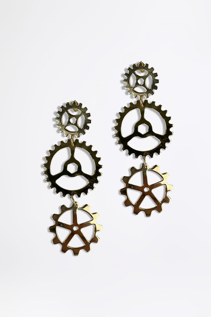 ユニークな歯車のデザインが目を引く、上質な銀メッキ加工を施した真鍮製ピアス。日常の装いにも特別な日にもぴったりのアクセサリーです。